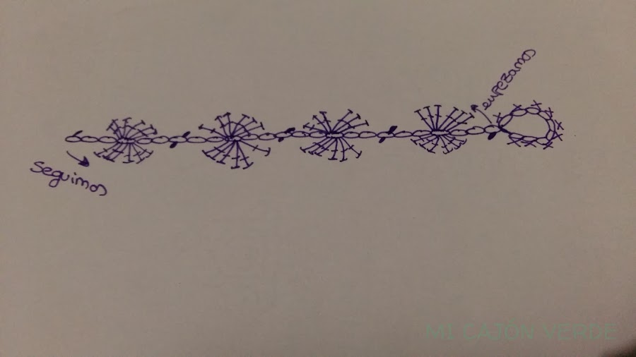 Por ejemplo si quiero 5 circulos (6*5 = 30 +1) en total 31 cadenetas. una vez hechas las cadenetas empezamos haciendo 6 puntos vareta en la 4ª cadeneta. Una vez hechas las varetas en la 3ª cadeneta siguiente haremos un punto deslizado. dejaremos 2 cadenetas libres y en la tercera haremos 6 puntos vareta. Y así hasta terminar.