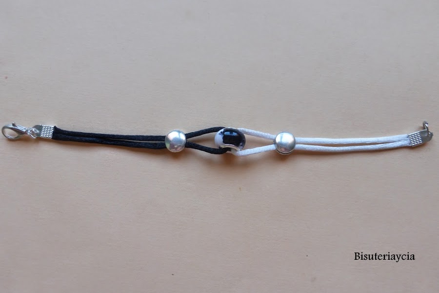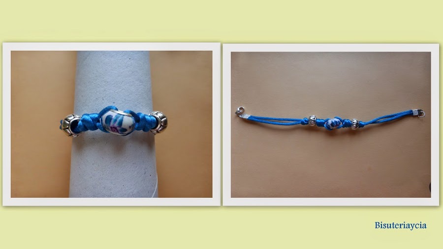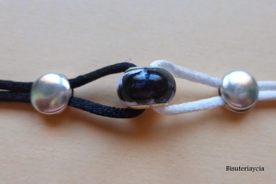 En este una vez colocada la pieza central hemos hecho un nudo simple y a cada lado hemos colocado una pieza metálica y hemos vuelto anudar.