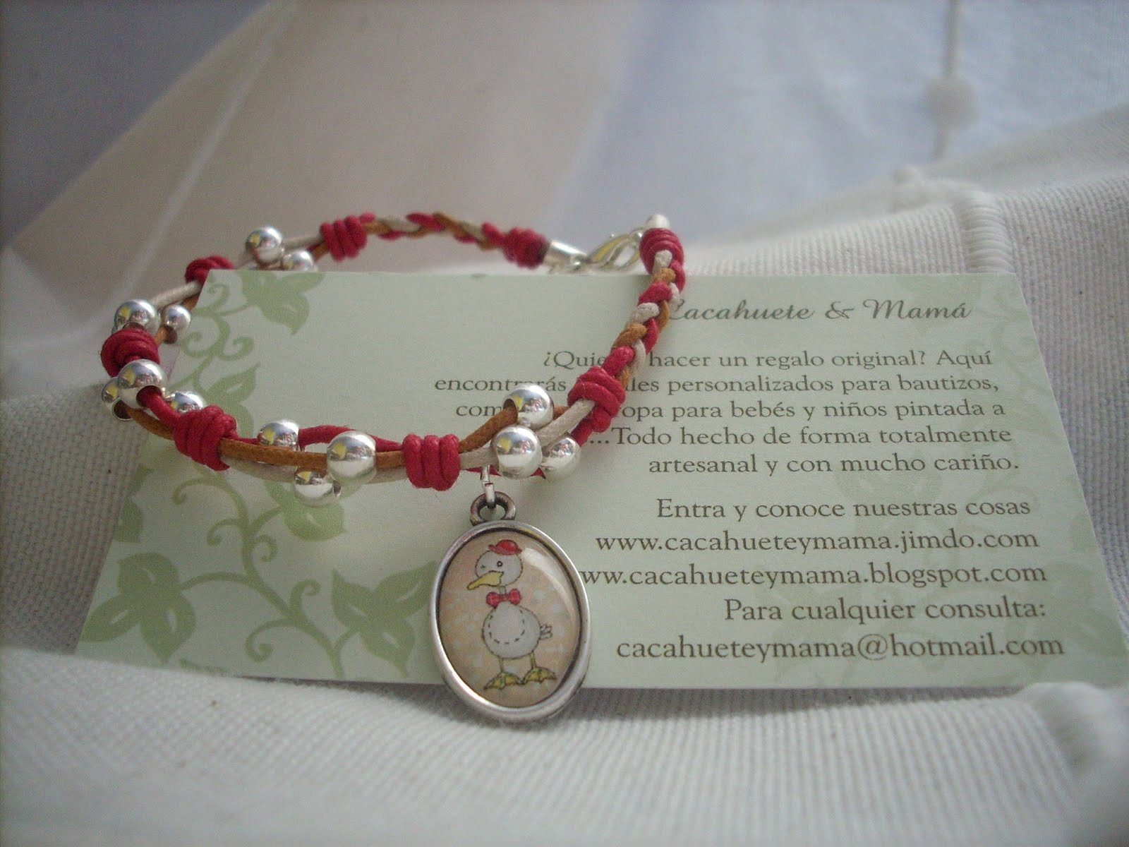 Esta en concreto, está hecha con cordón de algodón de 1,5mm, en varios tonos, bolas de 4mm de plata 925, cierre mosquetón de plata 925 y chapita. Precio 14 euros.
