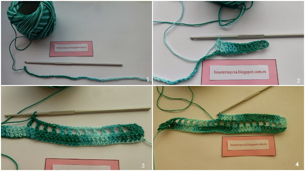 Una vez tengamos la cadeneta hecha, haremos una pasada con punto alto, una vez llegados al final, volveros con el mismo punto, pero esta vez dejando uno por coger, así nos ira quedando calado y nos servirá para cerrar la pulsera, para acabar usaremos otra vez el mismo punto y coseremos un botón en un extremo.