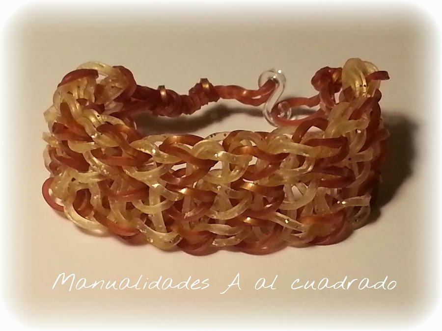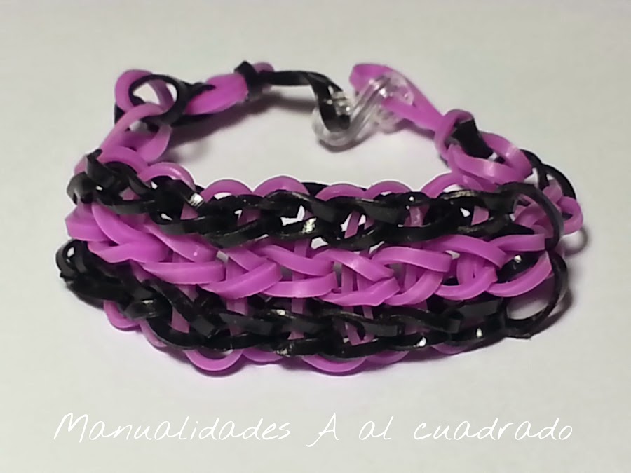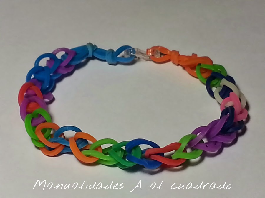 En esa entrada os mostré las pulseritas que había hecho inicialmente y luego un tutorial para enseñaros como se hacía una con un modelo muy sencillito. Después, también, me vino mi hijo con la moda de hacerlas en el cole, y total, que unas cuantas bolsitas más tarde y mirando lo tropecientos vídeos que rondan por youtube (la mayoría en inglés), he ido haciendo unas cuantas más y, como no!, os las tenía que enseñar.