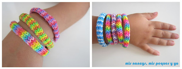 Para hacer las pulseras de gomitas seguimos un Tutorial muy bueno de una compañera bloguera? Manualidades Caseras. Hace todo tipo de bisutería y manualidades muy bien explicado? pulseritas, pendientes, cositas con fieltro? En concreto hemos seguido el Tutorial ?Manualidades para niños, Pulseras de gomitas?, y con un poco de ayuda? ¡eso sí!, conseguimos hacer estas preciosas pulseras con distintas combinaciones de colores, por supuesto elegidas por mis niñas? Claro!!