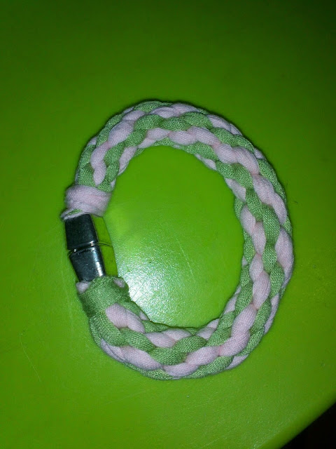 Hola a tod@s !! Esta semana os traigo mi primer trabajo con trapillo. Hace tiempo compré unos ovillos y la aguja de crochet correspondiente y nunca he sabido que hacer con ello, hasta que buscando por Youtube vi un tutorial de pulseras.De momento he hecho algo sencillito, cadeneta de 16 puntos y volver con puntos bajos hasta el principio, cerrar, anudar los cabos del principio y del final y cortar ...