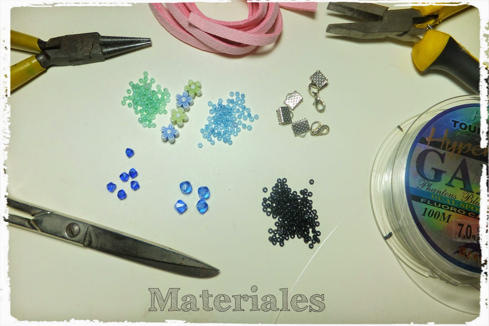 Necesitais el siguiente material; Cordón de cualquier material que sea plano, abalorios, rocallas, cierres de chafa, hilo de Nylon, tijeras, alicates de punta redonda y planos.
