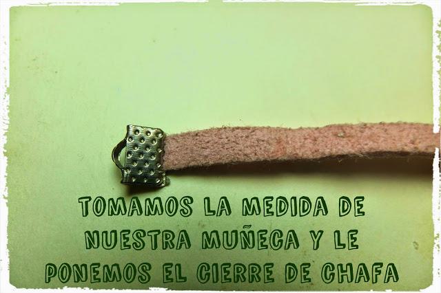 Tomamos la medida de nuestra muñeca y cortaremos un trozo del cordón plano. Es momento de ponerle en uno de sus extremos un cierre de chafa.