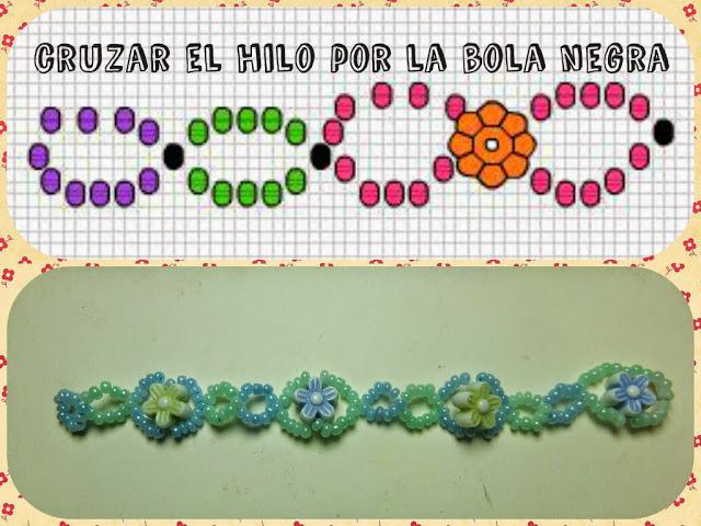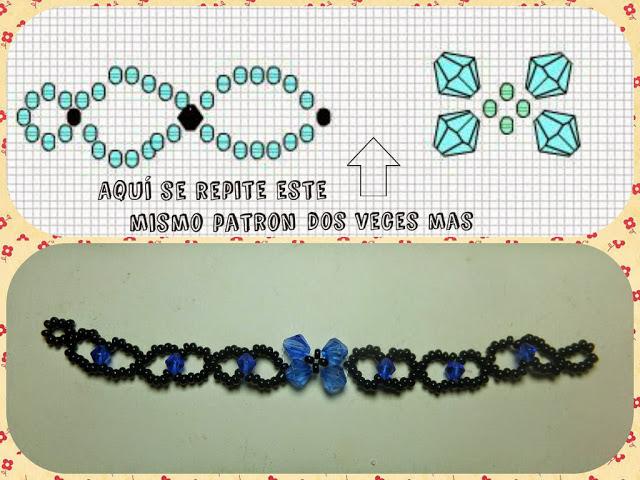 En el caso de la pulsera azul y negra, teneis que reperir el segundo y tercer eslabon dos veces mas, está marcado con una flecha en el dibujo.