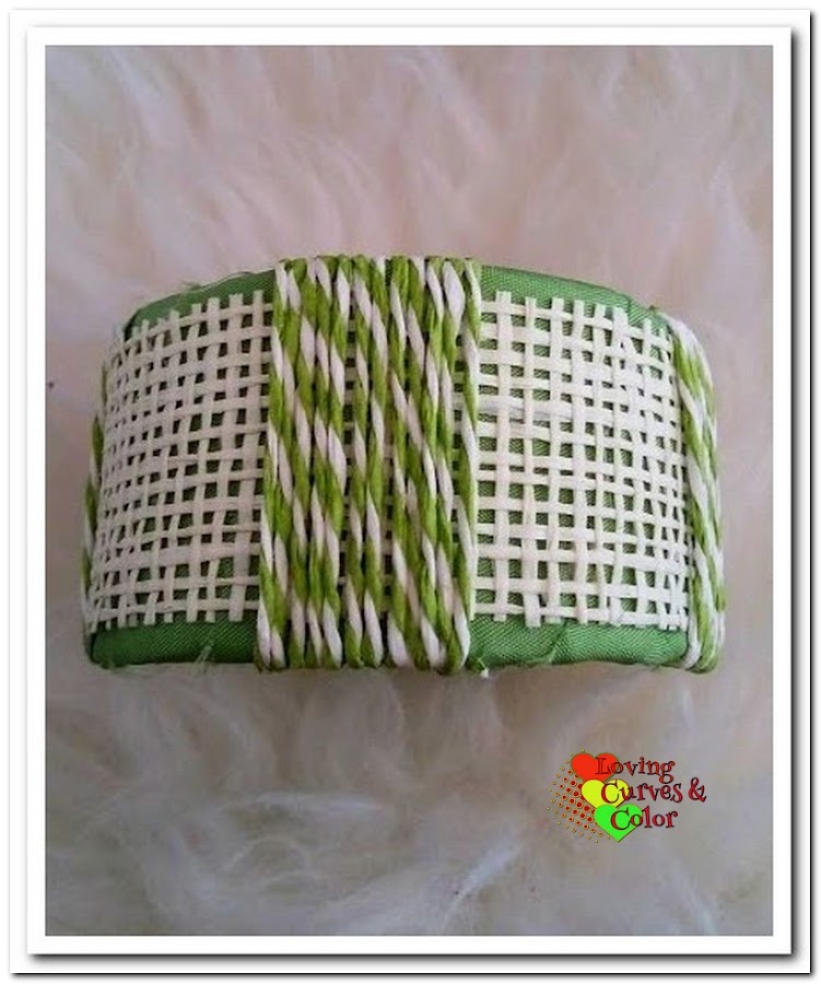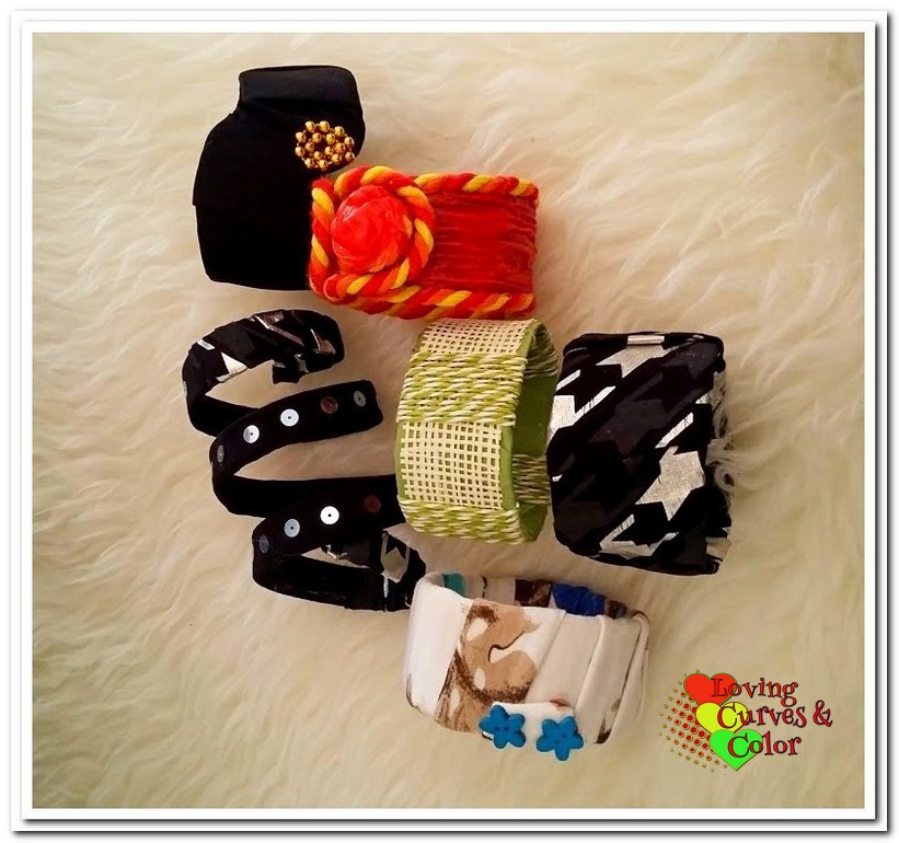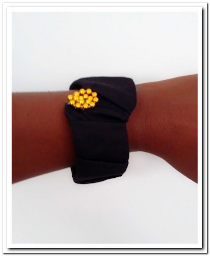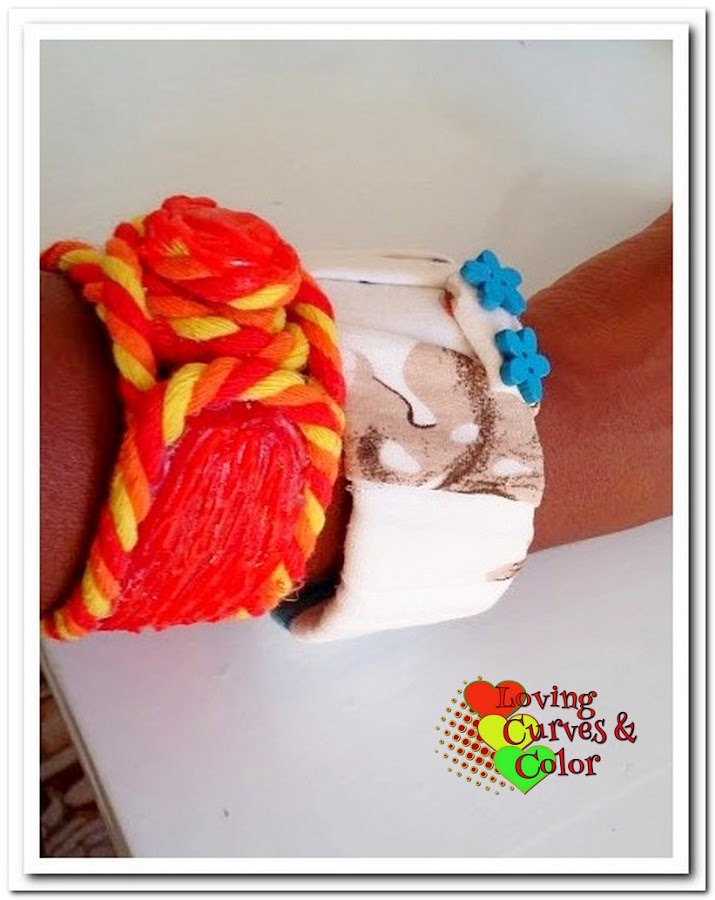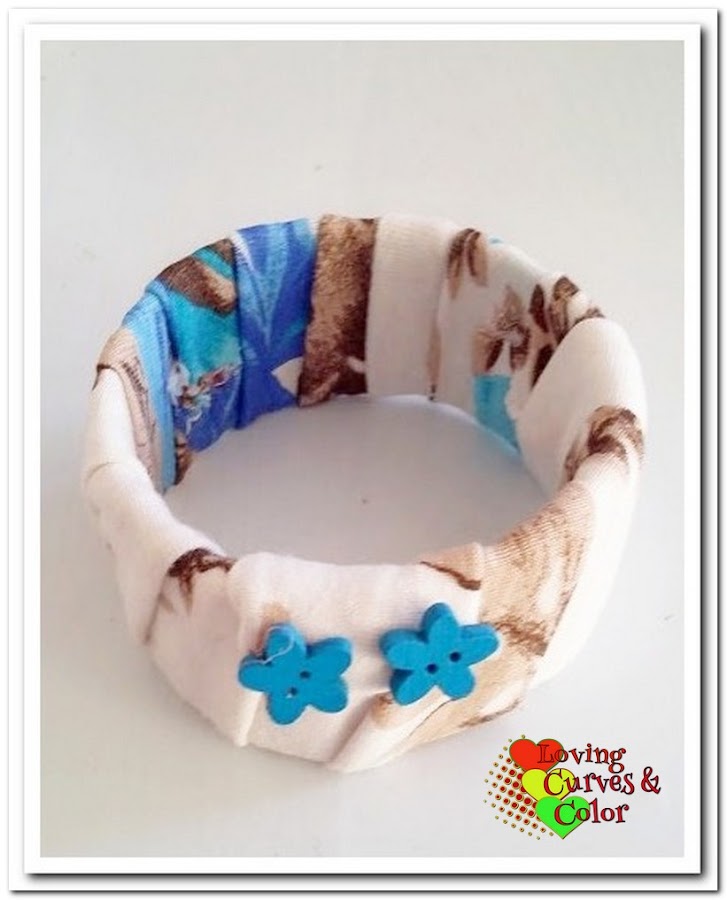 En esta otra pulsera use el mismo método de enrollado de la tela alrededor pero la terminación fue diferente al igual que los adornos, en este caso utilice botones de madera.
