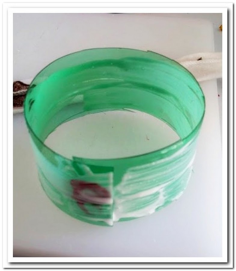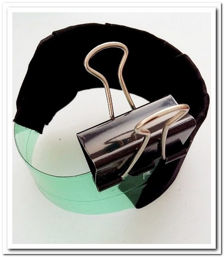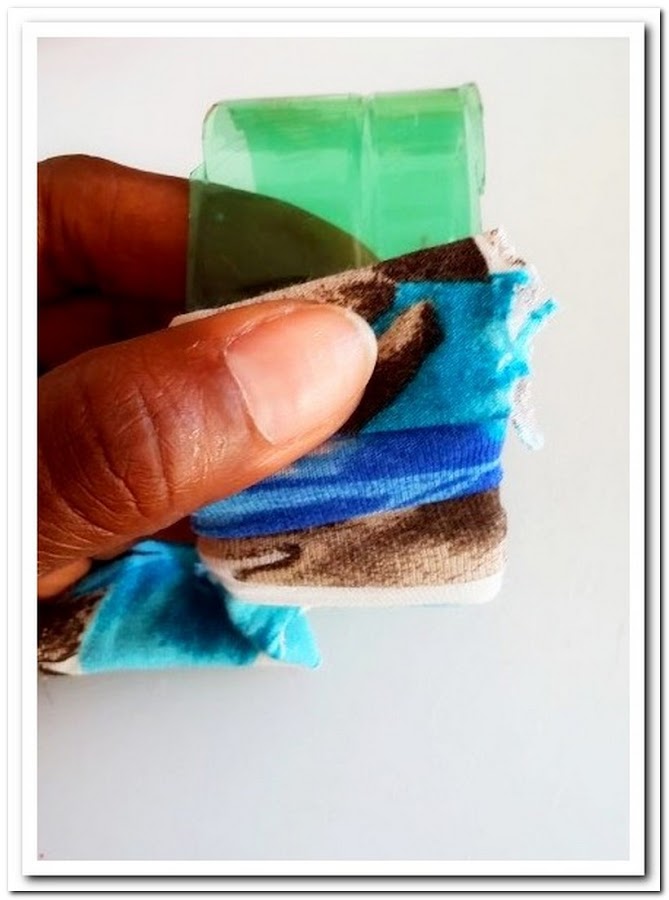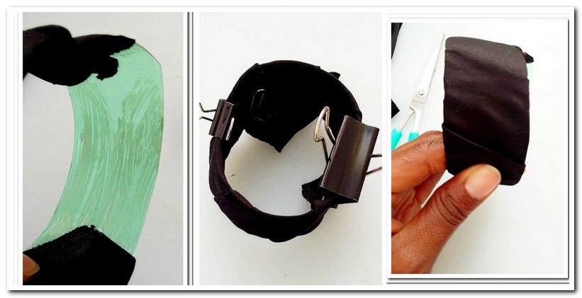 Pon cola en el plástico y con la tela que hayas escogido, enrollala alrededor de la futura pulsera.