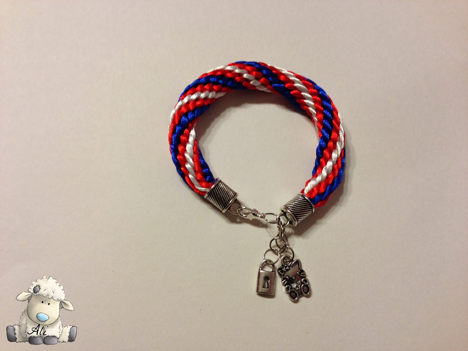 A la vez, Alicia, mi hija, ha hecho una pulsera para la hija de una amiga mía. Se la había encargado en colores rojo, azul y blanco, y la verdad es que la combinación ha quedado muy chula (la pregunta de mi hijo es si tiene un novio o algo así inglés, porque son los colores de la bandera inglesa).