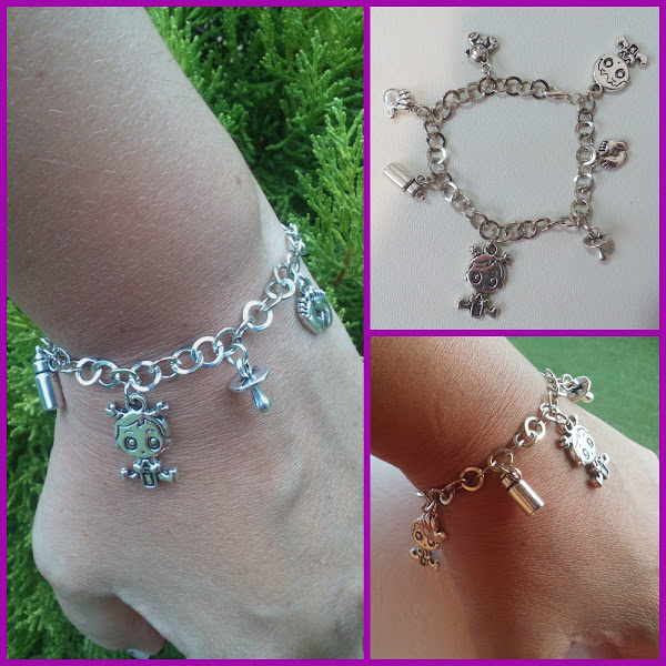 La primera es esta con cadena plateada y tiene varios charms sobre bebés: