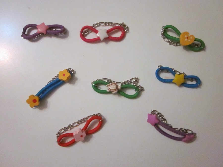 CON UNA CADENITA, GOMAS DEL PELO DE COLORES Y ALGÚN BOTÓN O ABALORIO... TENEMOS UN DETALLE PARA NIÑAS Y NO TAN NIÑAS