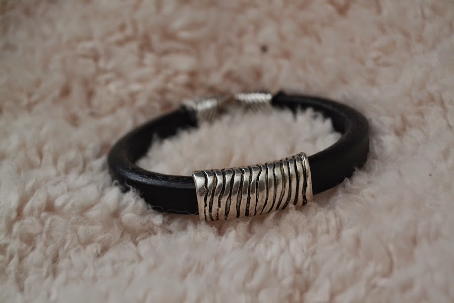 ¡Hola!Hoy os quiero enseñar las primeras pulseras para chico que he hecho, a ver qué os parecen. La primera es de cuero negro a la que he puesto tres entrepiezas: La segunda es también de cuero negro, he usado dos entrepiezas y en medio he puesto una tira de piel en marrón:
