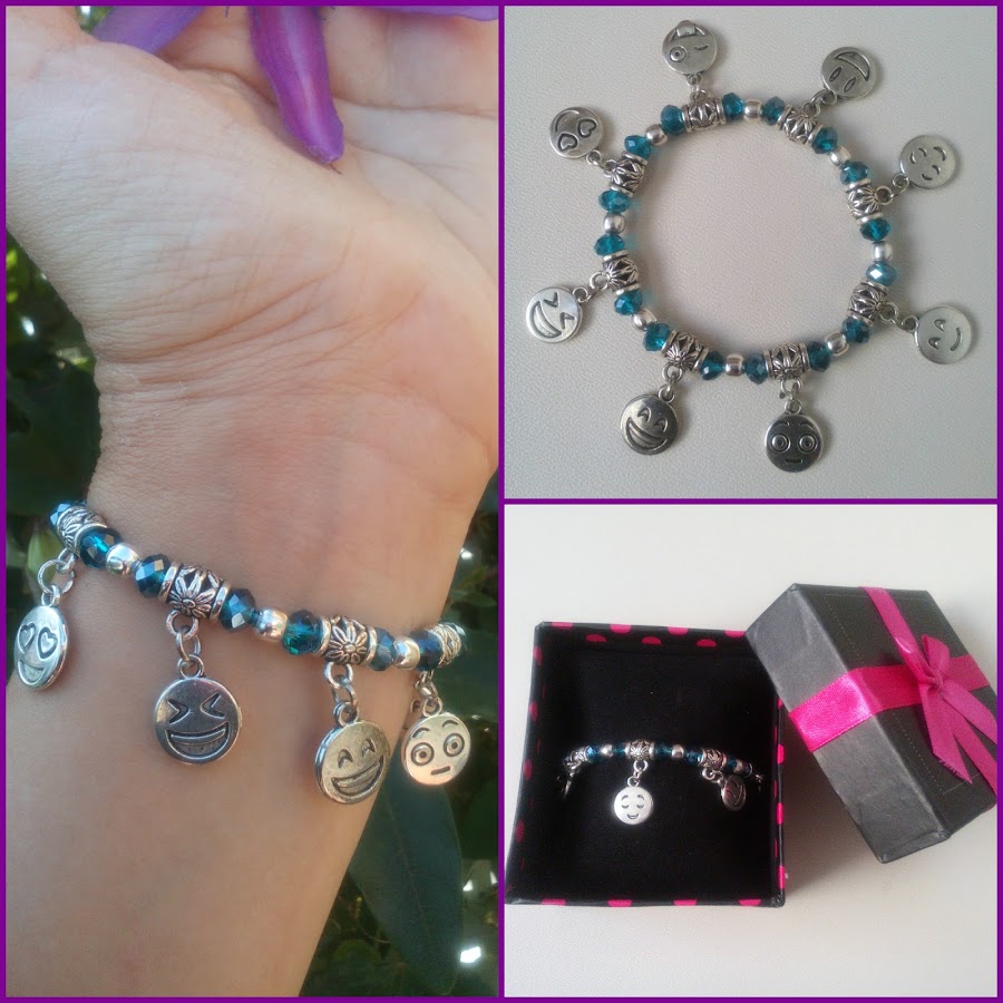 Y ahora os voy a enseñar dos pulseritas nuevas con colgantes de emoticonos de Whatssap que he hecho, esta vez con cristalitos de colores y elásticas.