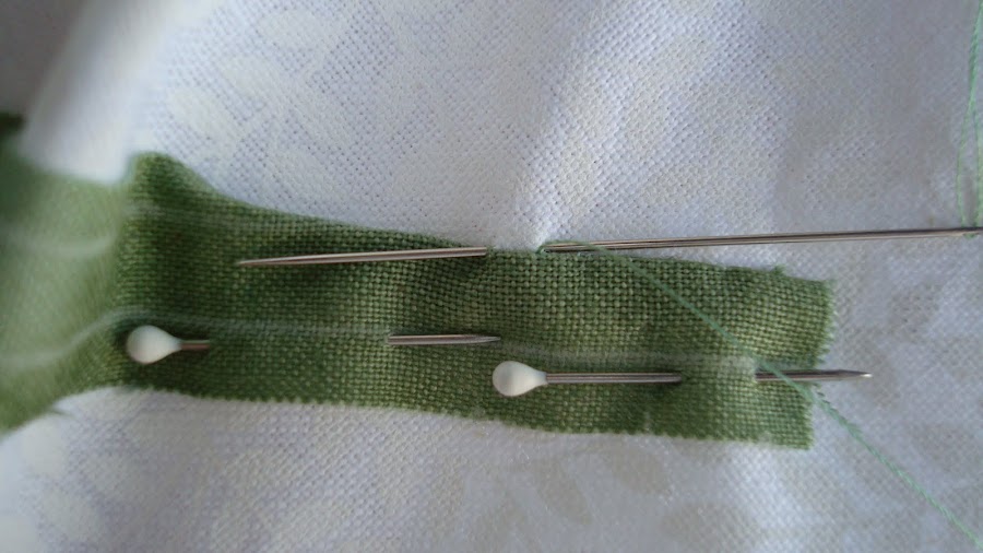 - tiramos del hilo, doblamos un poco de la tela, dejando la línea de dibujo escondida. Clavamos la aguja en la tela del fondo UNOS DOS HILOS HACIA LA DERECHA DE LA AGUJA Y UNOS DOS HILOS MAS ABAJO . Esto es muy importante, pues si lo haces al revés, el hilo se verá, seguro, y eso es justo lo que no queremos. Pon mucha atención en este paso cuando cosas.
