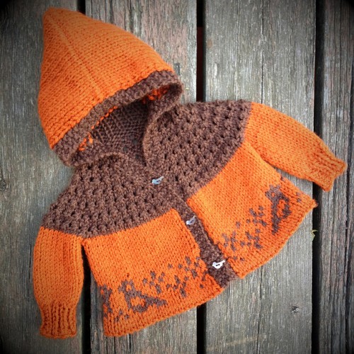 You can find the free pattern of this baby sweater on Yarn Lovers Room.