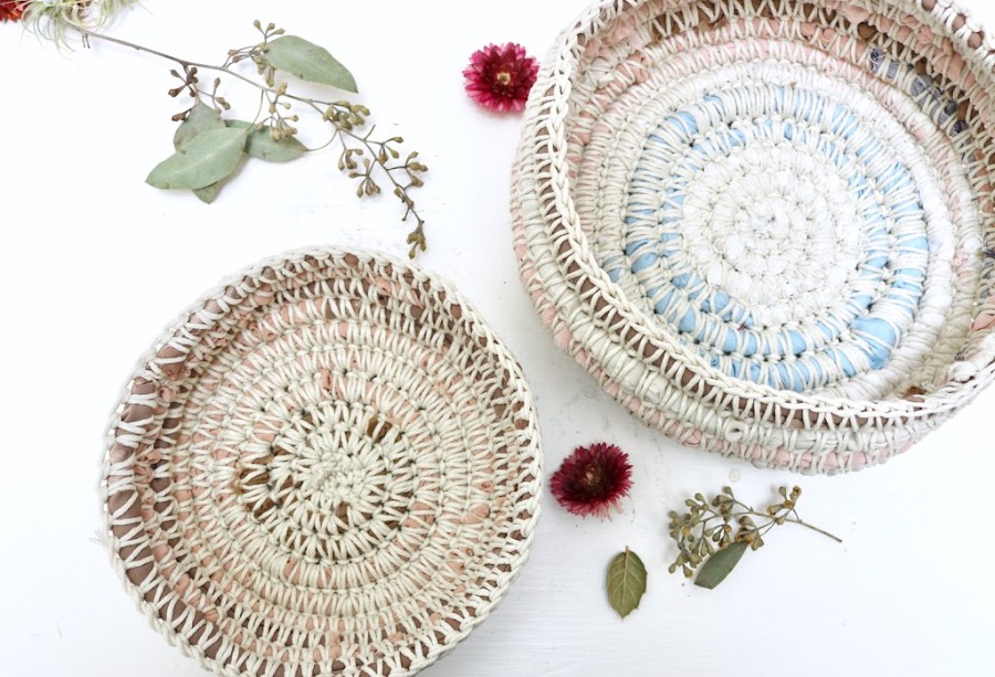 Great crocheted fabric scrap baskets DIY by Salvage & Stitch.