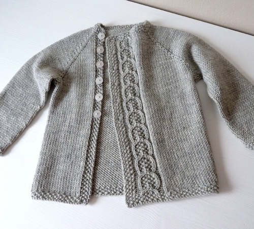 Baby cardigan, free pattern by Taiga Hilliard.