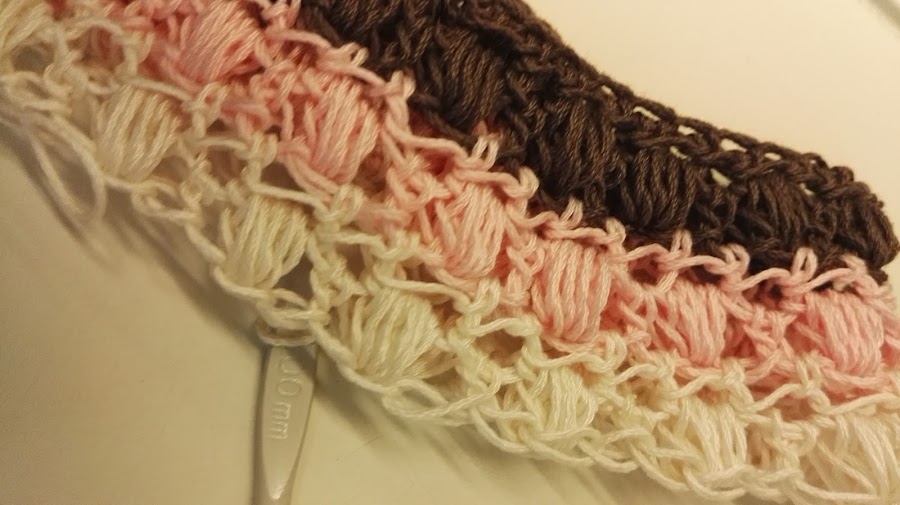 El punto elegido fue el punto popcorn,piña o bobble stitch (será por nombres), y tras elegir el punto tenía claro que haría una mantita para bebé fresquita de algodón para las noches de verano cuando se sale de paseo o a tomar un helado .