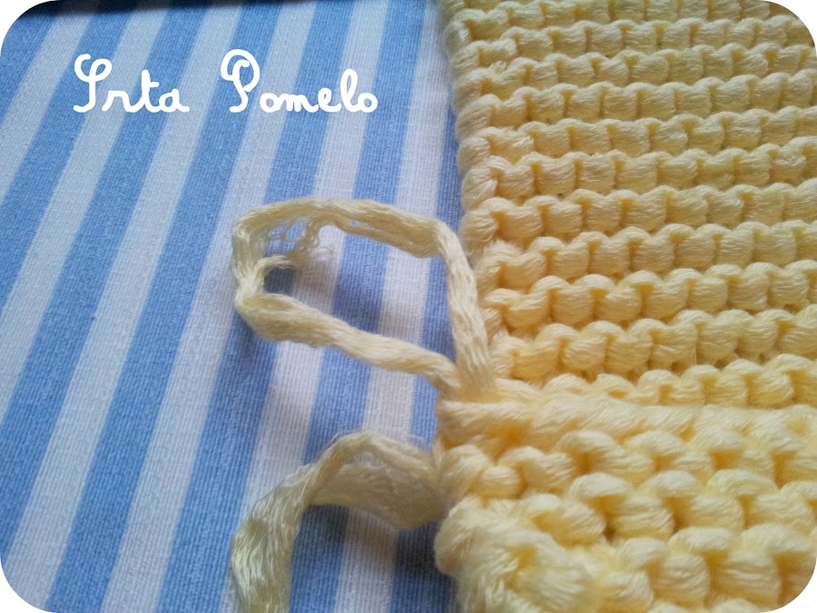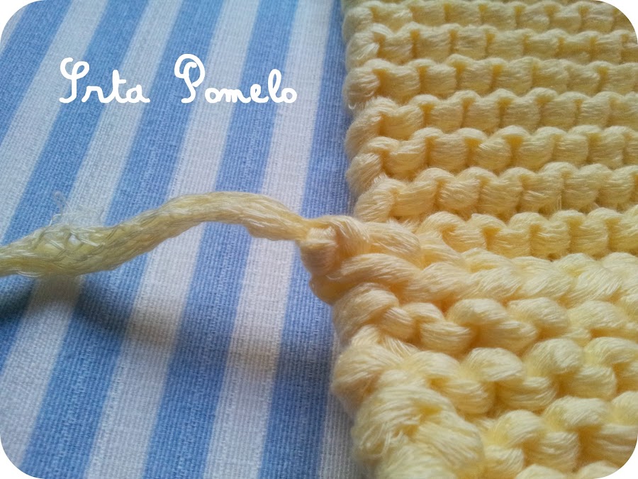 En el último punto nos queda un bucle, como en los puntos de crochet. Lo que hacemos es meter el extremo de la hebra y tirar, apretando el bucle y cerrando el punto. El hilo o lana sobrante debemos esconderlo entre los puntos, nunca cortarlo al ras, porque podría deshacerse el trabajo.