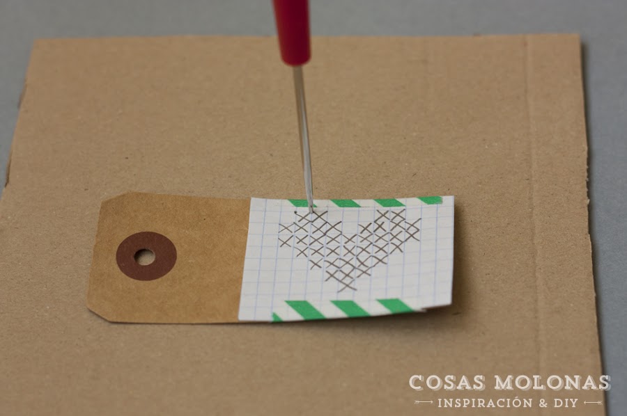 Luego habrá que perforar con un punzón o aguja gruesa el papel que queremos decorar, hay que hacerlo justo por el cruce de las lineas (tienes los pasos básicos abajo). Sencillísimo.