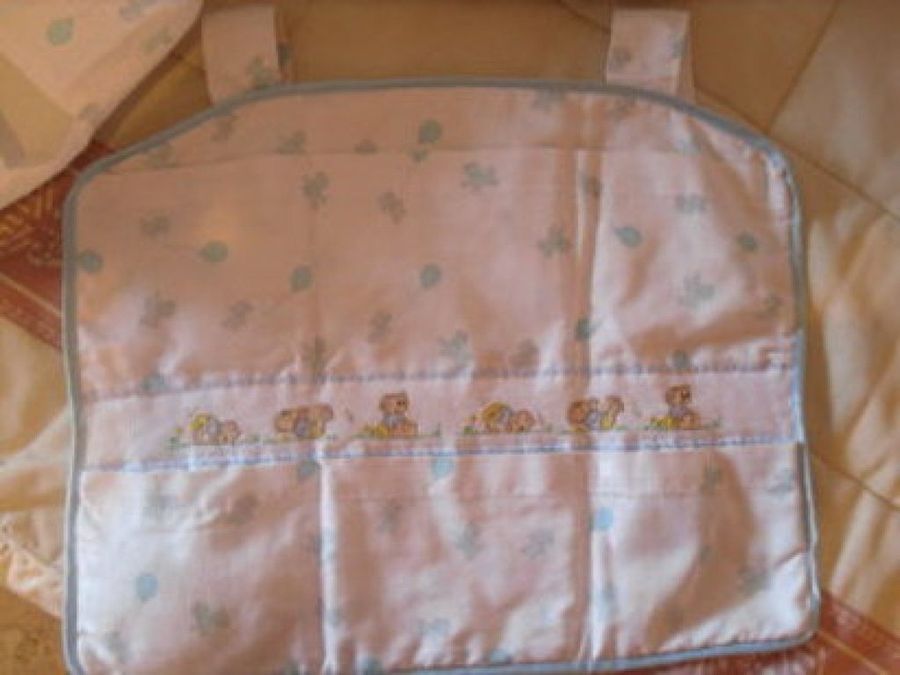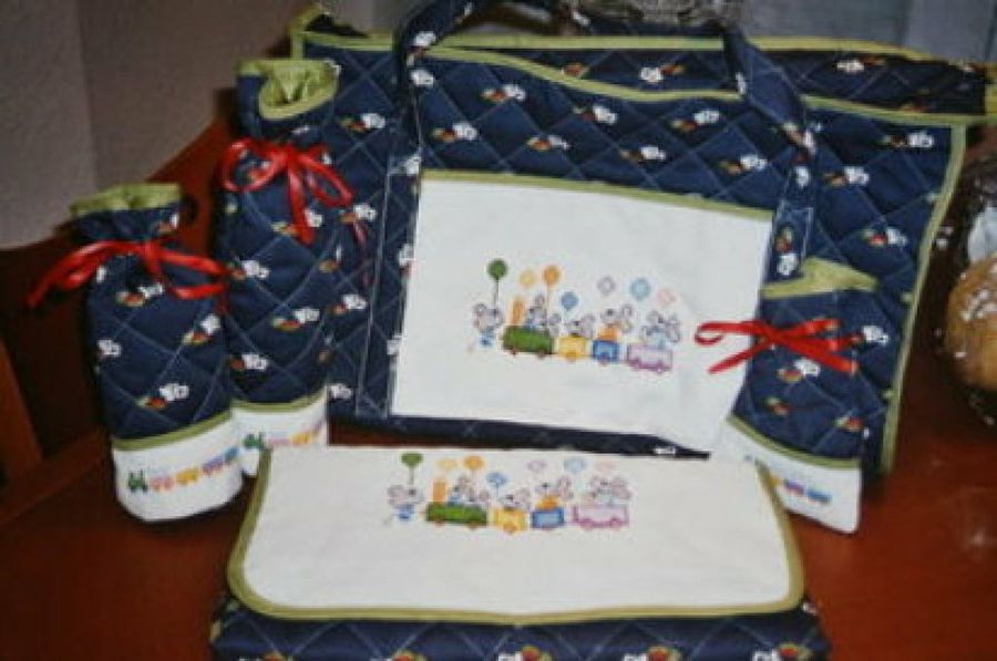 La usuaria Adhara personalizó este bolso de premamá, las bolsitas para el termo y el cambiador. En ellos tejió a punto de cruz una simpática familia de animales muy apto para un bebé.