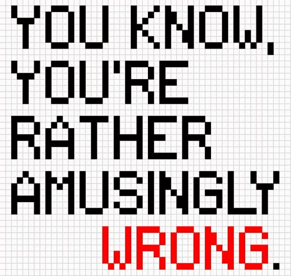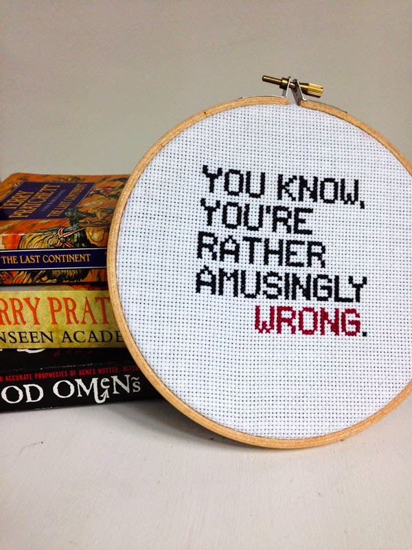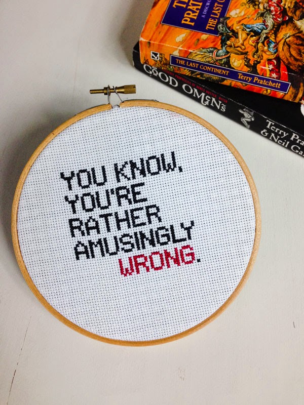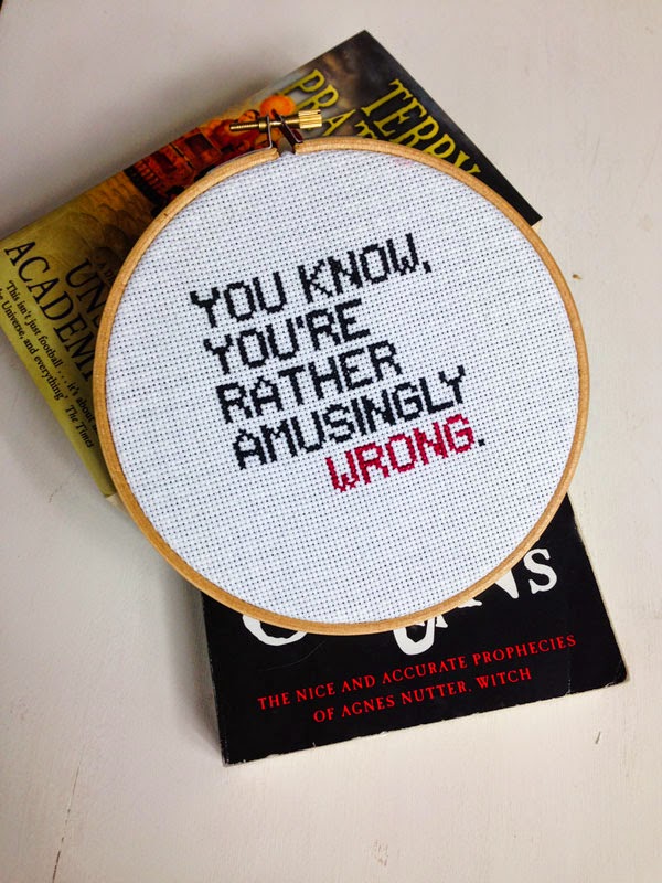 Así que pensé que no podía dejar de hacerle un pequeñísimo homenaje, y aquí está mi cuadrito de punto X con una estupenda y ligeramente sarcástica frase, difícil de traducir con todos sus matices, pero que vendría a ser, literalmente: "¿Sabes? Estás graciosamente equivocado." Con un puntito condescendiente, pero con esa corrección británica que siempre me arranca una sonrisa.