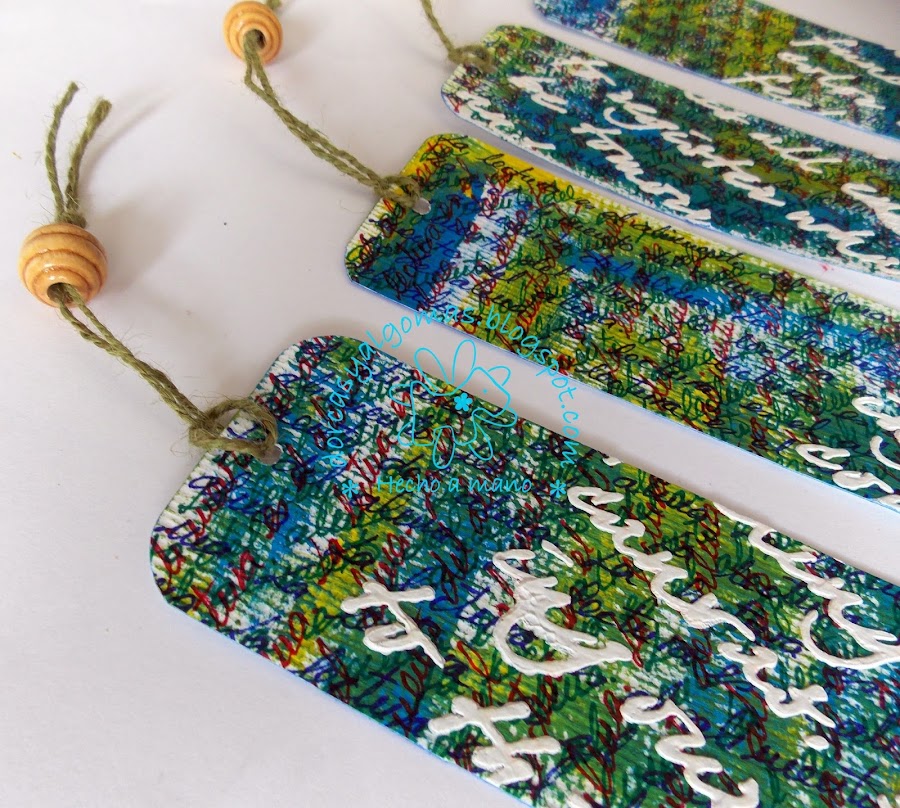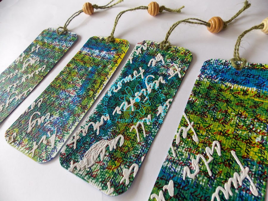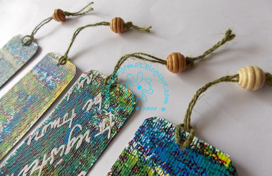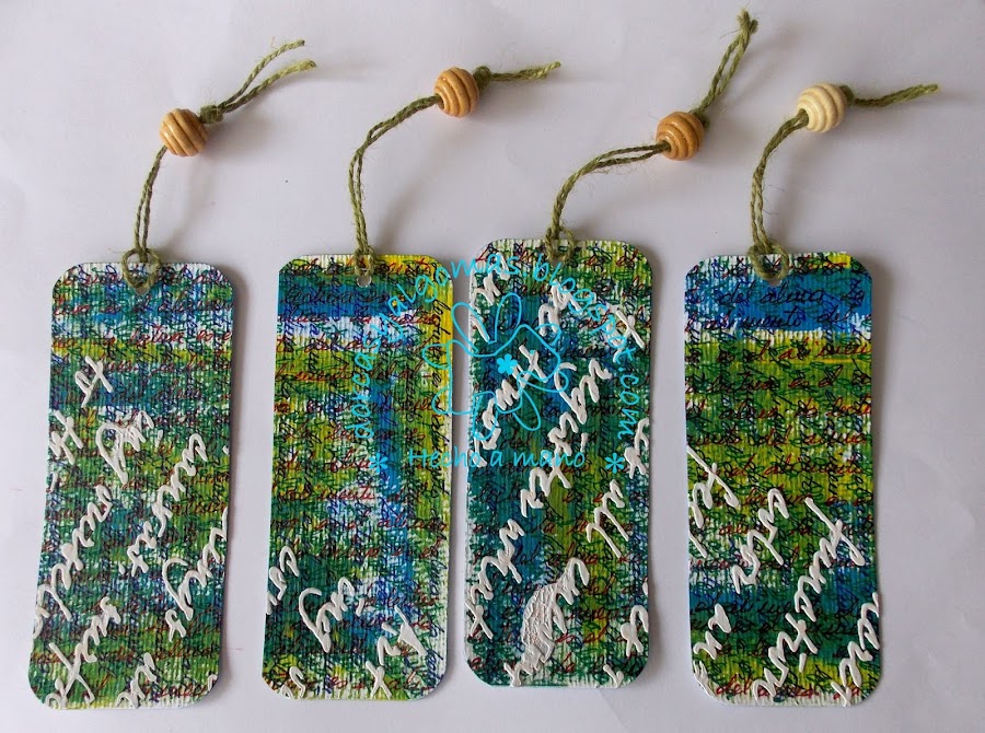 Estos son los que yo hice. Trabajé el fondo de los 4 puntos de libro como si fueran uno, luego los recorté y salieron todos distintos.