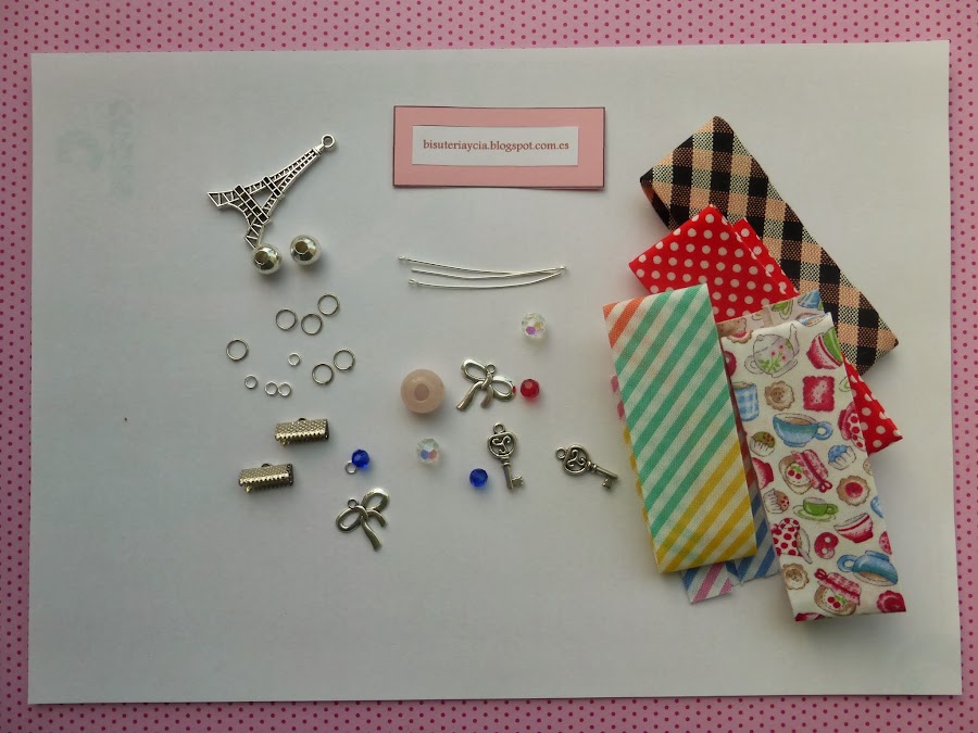 Los materiales, muy sencillo, cinta de tela, terminales planos, anillas, abalorios, colgantes... a y mucha imaginación.