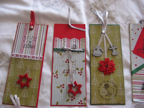 Los he hecho con poco volumen, asi si alguien los quiere utilizar para algun lubro no estorbaran demasiado. Tanto los papeles utilizados, como los adornos y las cintas ya lo tenia del año pasado.