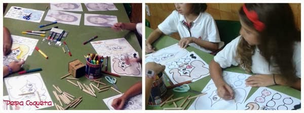 Se necesitan pocos materiales, las láminas-plantillas con dibujos las podéis descargar desde aquí (yo les quité el color para que además pintaran a su gusto), lápices de colores y/o rotuladores, tijeras, tiras de imán y la foto de cada protagonista.`