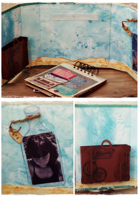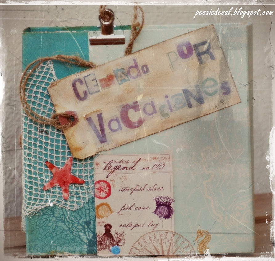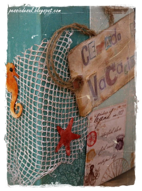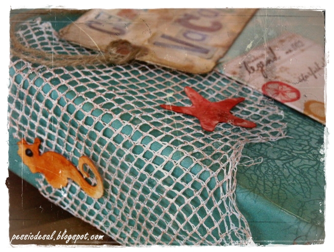 Es una caja, ambientada con elementos marinos; la red y los diferentes animalitos, trabajados con tintas distress para darles color y volumen... y una etiqueta envejecida, recreando los efectos del desgaste por el agua y la brisa del mar...con el título hecho utilizando letras recortadas de revistas, que he usado para el cierre junto con cuerda y una pinza.