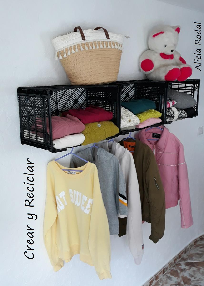 Para tener un armario grande sin gastar mucho dinero. Estas cajas o cestos de plásticos se pueden usar tanto de pie como de lado. En este caso vamos a usar estas cajas de lado o acostadas.Lo que más me gusta de esta idea, es que puedes adaptarla a tu espacio y necesidades. Puedes poner 2 columnas de cajas juntas, poner otro palo o tubo por la mitad, hacerlo más alto o más bajo, poner varias columnas con tubos más cortos entre medio, etc.
