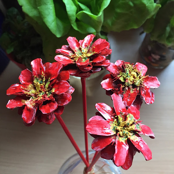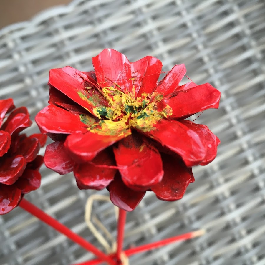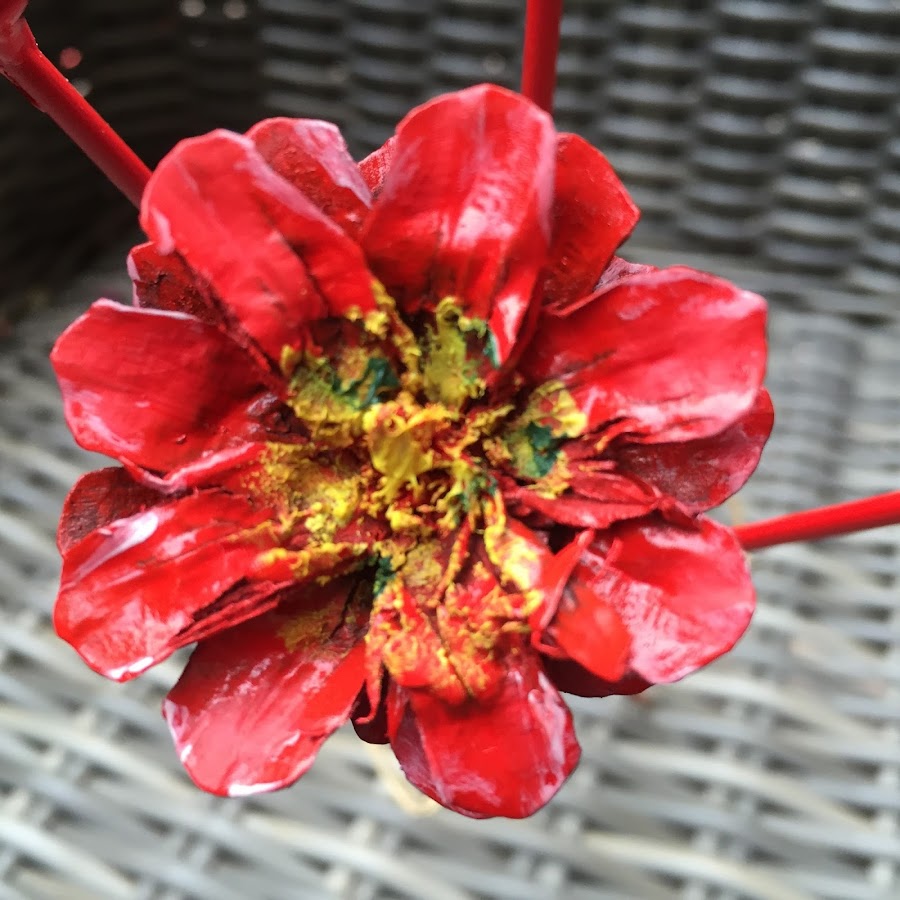 - Pintamos con pintura roja en spray. Una vez seca (al menos un día), pintamos el centro de "la flor" con pinceladas de pintura amarilla, ocre y verde.