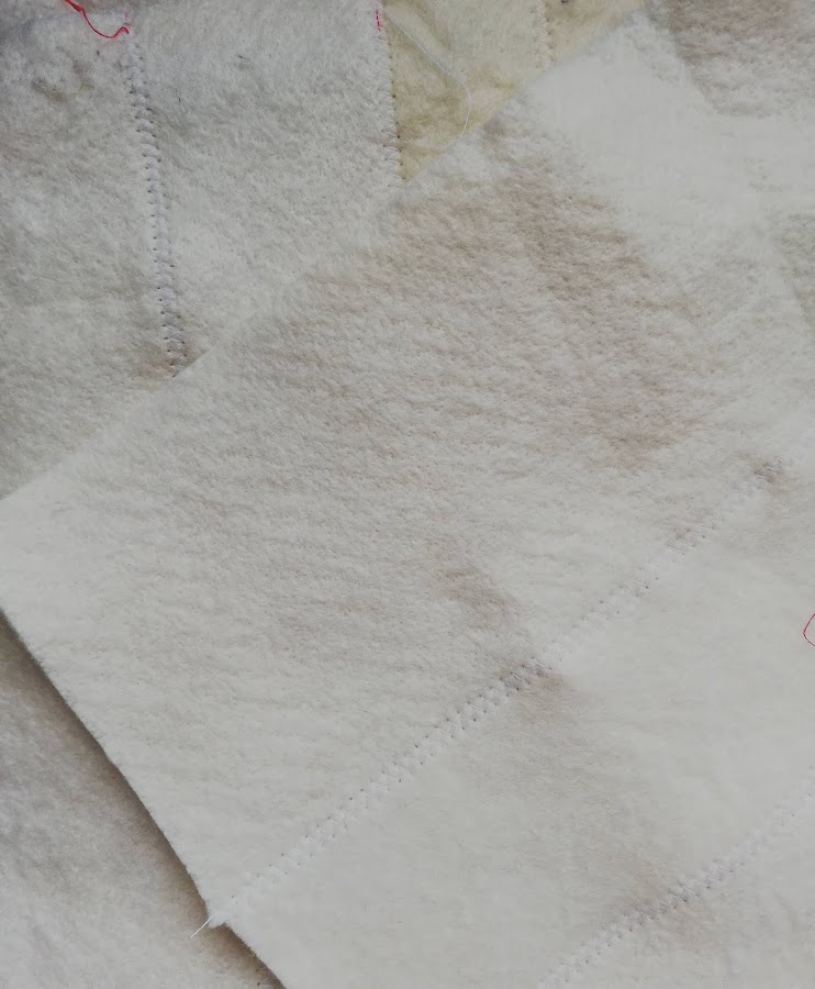 Con las telas verdes lo hice un poco diferente. Fui cogiendo trocitos pequeños y los fui uniendo hasta hacer unos trozos más grandes.