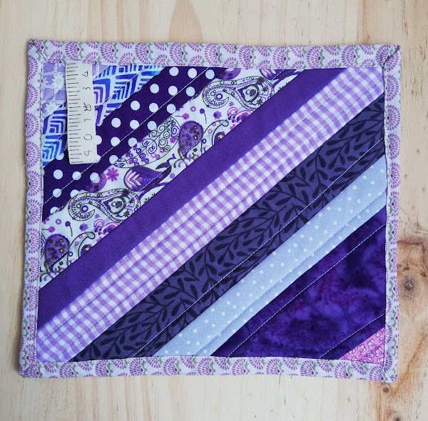 Para la primera cogí la bolsa de telas lilas y decidí hacerla parecida a mis bloques de la colcha de string quilt.