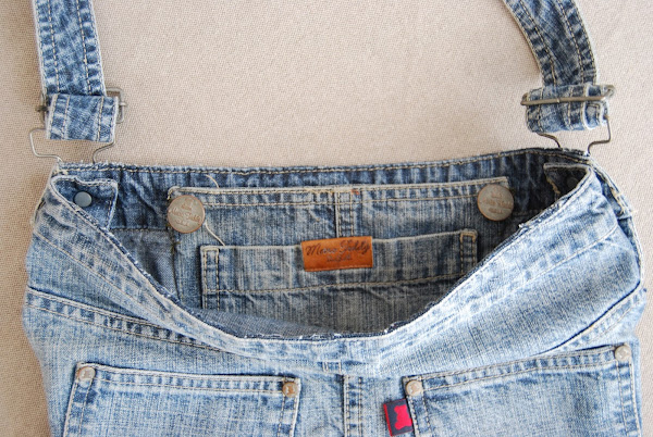 Paso seis: como nada nos gusta más que tener muchos bolsillos dentro de un bolso, cortamos la parte del bolsillo del peto y lo cosemos en la parte interior del bolso (del mismo modo que hicimos en su momento con el shopping bag):