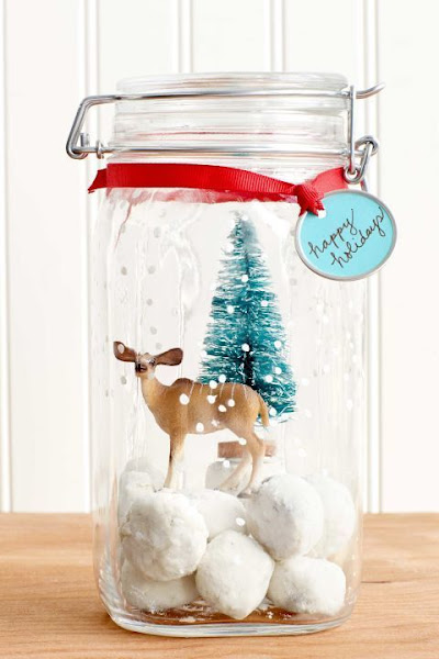 3. Coloca baratijas de plástico dentro de los frascos como, por ejemplo, un reno y un árbol navideño y ata una tarjeta o etiqueta de regalo en cada uno de los frascos con cinta roja o verde.