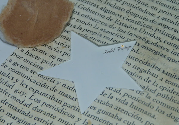 El último de los tarros reciclados lo he forrado con papel de libro (podéis utilizar papel de decoupage con motivos de escritura o musicales). Una vez cortado a la medida necesaria, he dibujado una estrella y la he cortado con el cúter de precisión.