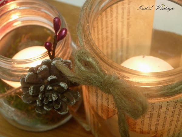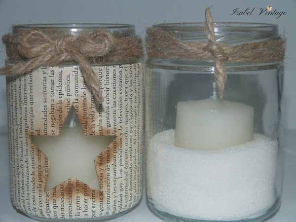Por último he sombreado el contorno de la estrella con tinta distress y he adherido el papel al frasco con cola blanca. Una cuerda con lazada en el cuello y terminado. Os enseño los dos juntos ya tranformados en portavelas: