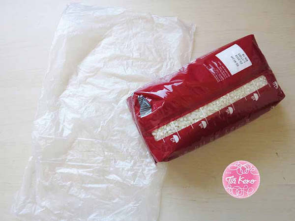 Y ha llegado el momento de meter el arroz en el saquito de tela que hemos hecho. Ponemos el kilo de arroz en una bolsa de plástico y lo ponemos dentro del saquito,