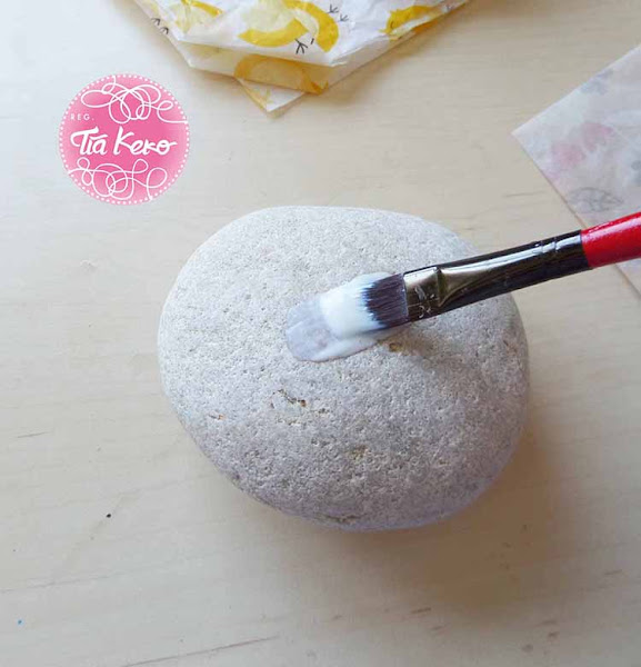 Continuamos con la piedra decorada con la TÉCNICA DEL DECOUPAGE. Lo primero será limpiar la piedra con agua y jabón y cuando esté seca ponemos una capa de cola especial de decoupage en la piedra, luego ponemos el papel especial encima y otra capa de cola de decoupage,