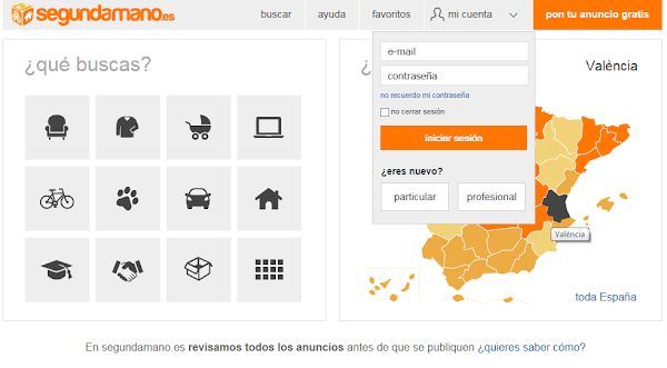 SEGUNDA MANO: A la derecha la página de incio y como registrarte, en segunda mano revisan tus anuncios y luego los publican, asi que no están inmediatamente en la red, a la hora de subir los anuncios muy facil y rápido, es gratuita aunque tienes paquetes de pago si quieres vender antes y promocionar tu artículo, eso ya lo decides tu, yo los publico totalmente gratuito y he hecho varias ventas con ellos. Así que la recomiendo mucho. Su APP genial muy rápida y con todas las funciones básicas, no se pueden editar los anuncios a traves de ella. Así que si quieres modificar algo de un anuncio ya publcado tienes que hacerlo a través del ordenador.