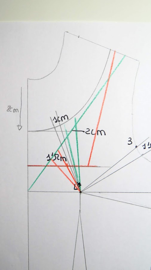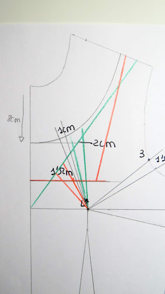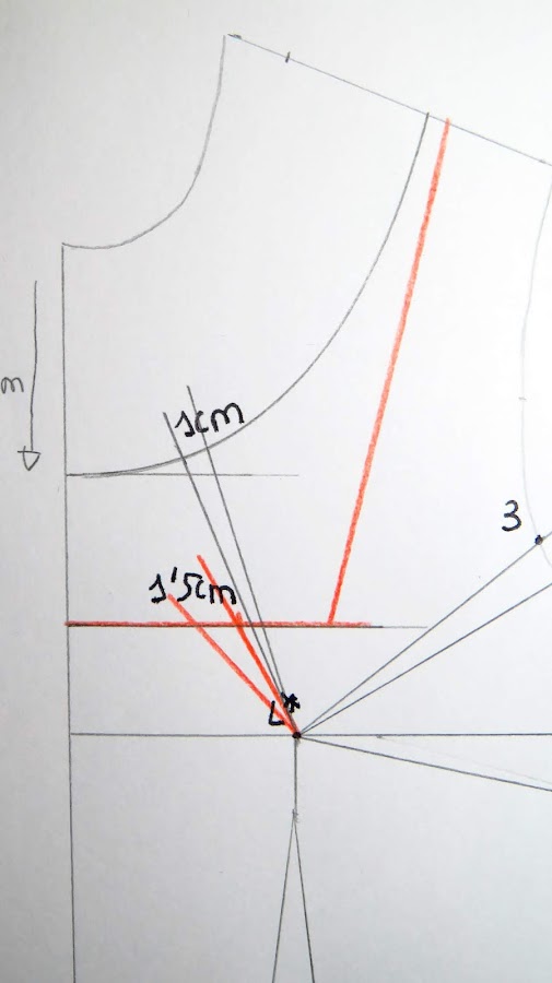 En rojo te he dibujado otro ejemplo. Este escote es más amplio, por lo tanto hemos hecho una pinza de 1,5 cm