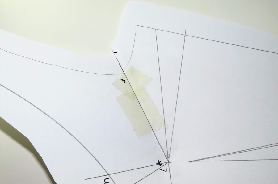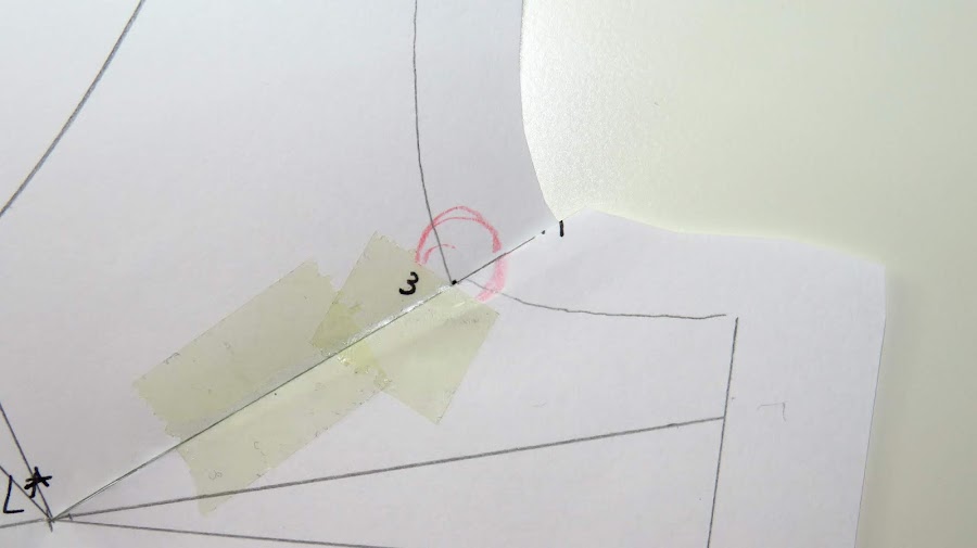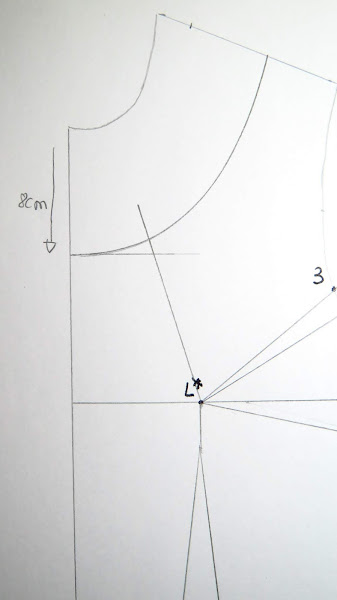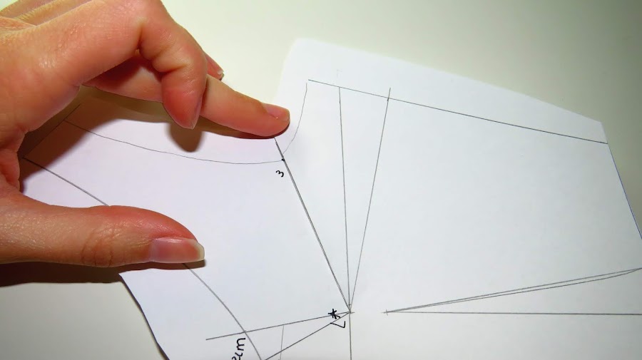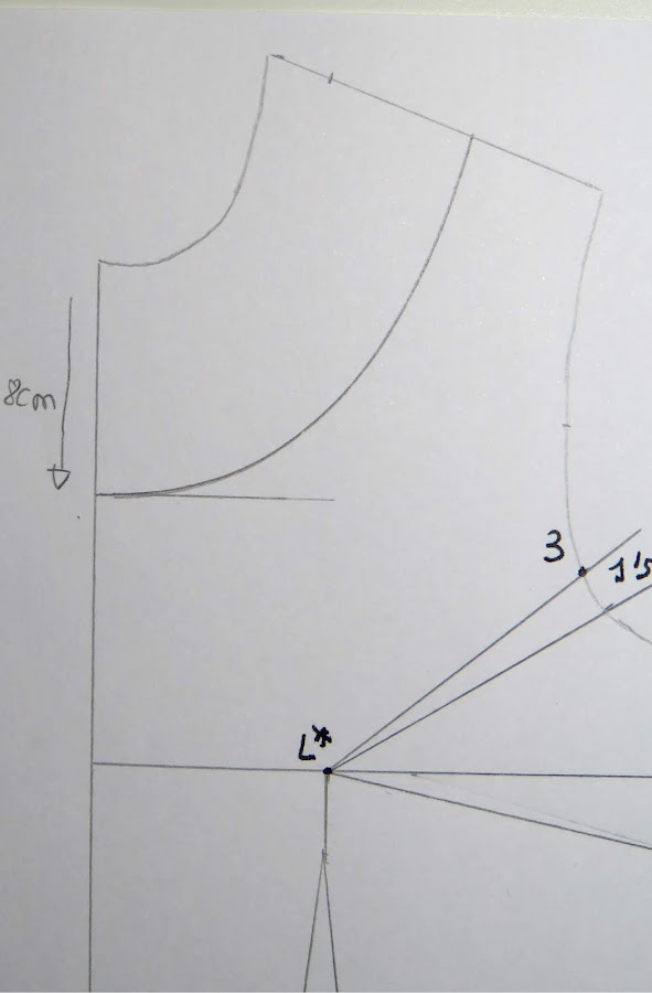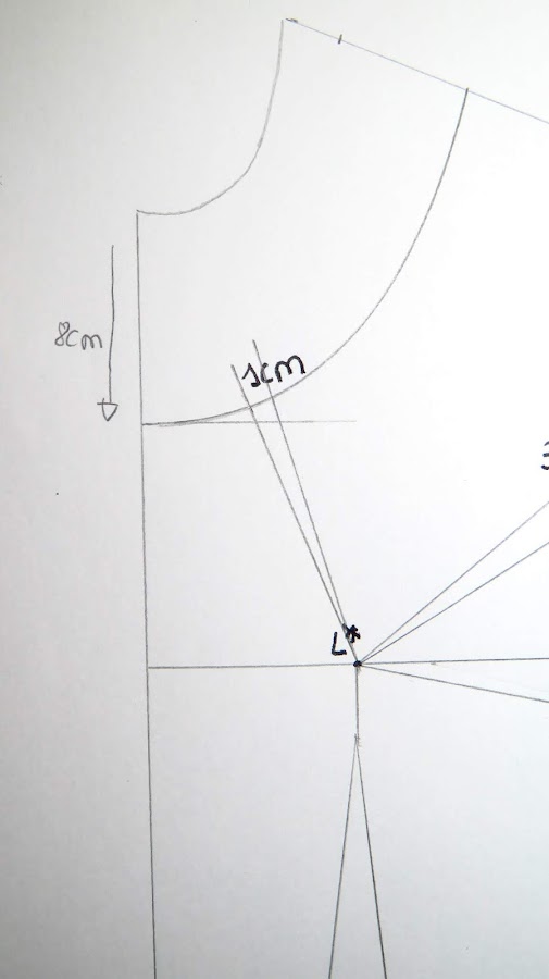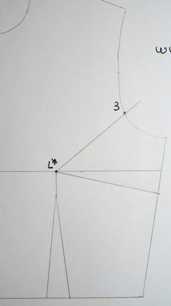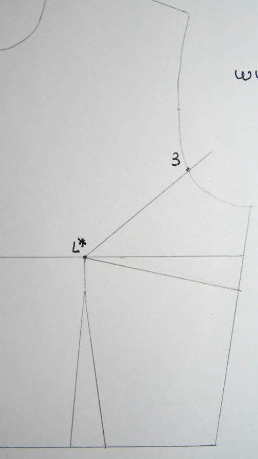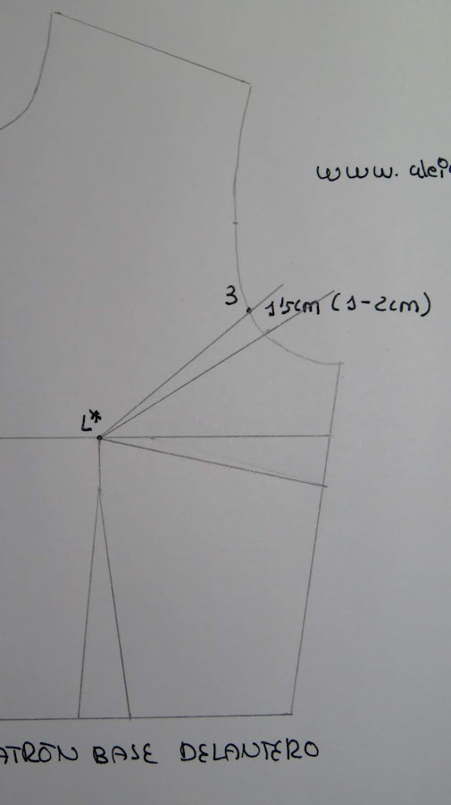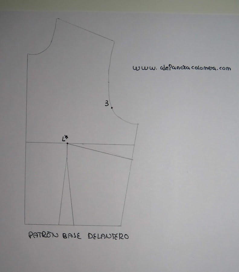 Trazamos una línea desde L* hacia la 1/2 aproximadamente del costado. Esto nos servirá para trasladar todas las pinzas que hemos cerrado, y crear una nueva en esa zona. En este paso ya te he dado alguna pincelada de los traslados de pinzas, que veremos próximamente.