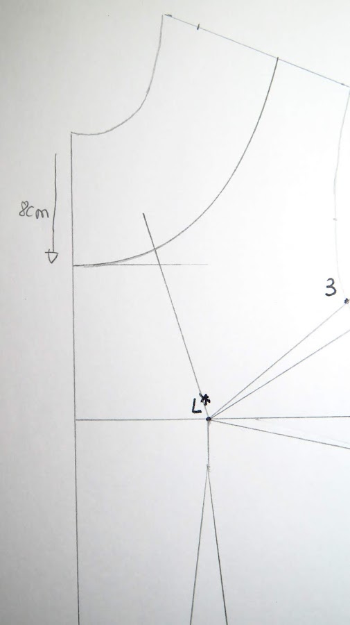 He dibujado un escote de ejemplo, bajando 8 cm desde la base del cuello. Es un escote lo suficientemente abierto, como para corregirlo con estas pinzas.