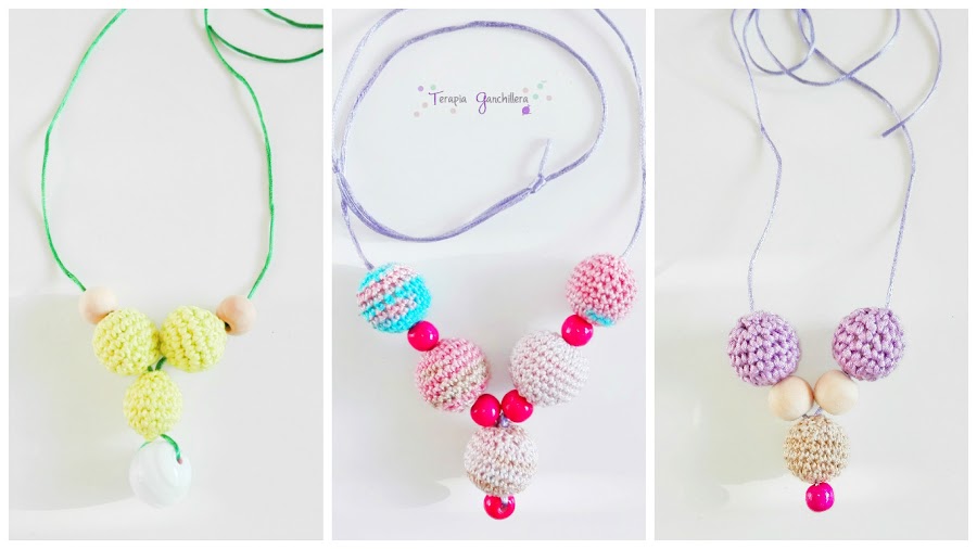 Estos collares están formados por bolas de madera que puedes tejer con ganchillo para personalizarlos, o simplemente dejarlos con su apariencia natural.
