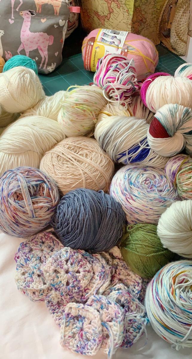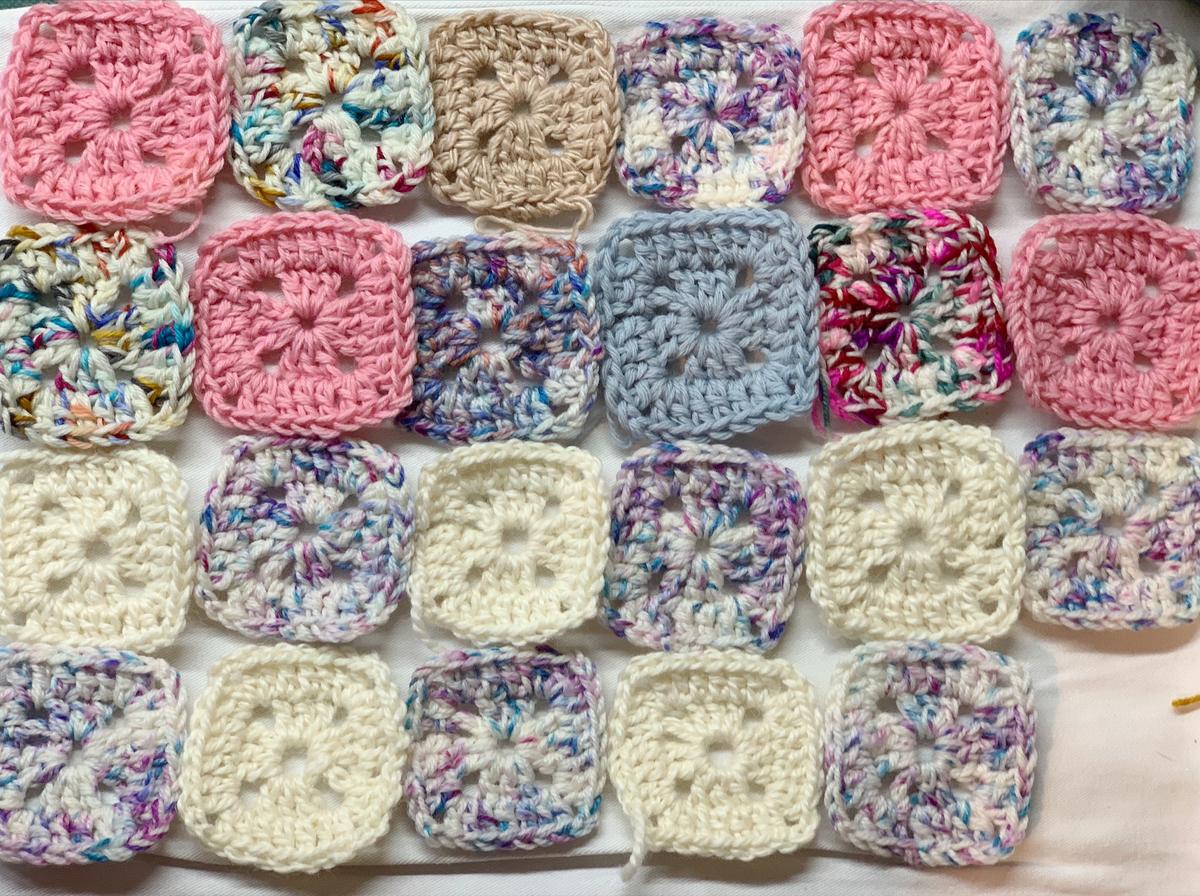 Luego cuadrados en lana matizada con cuadrados lisos de otros colores como rosa de varios tonos y celestes. Pero no…no funcionó. Me iba a pasar cosiendo cuadrados hasta fines del año que viene.
