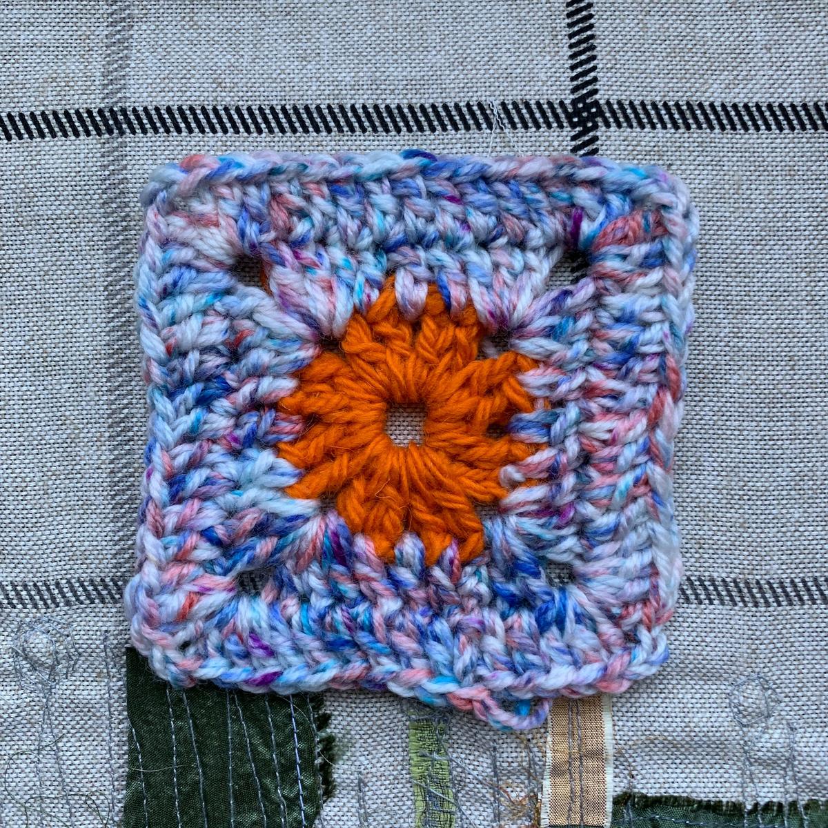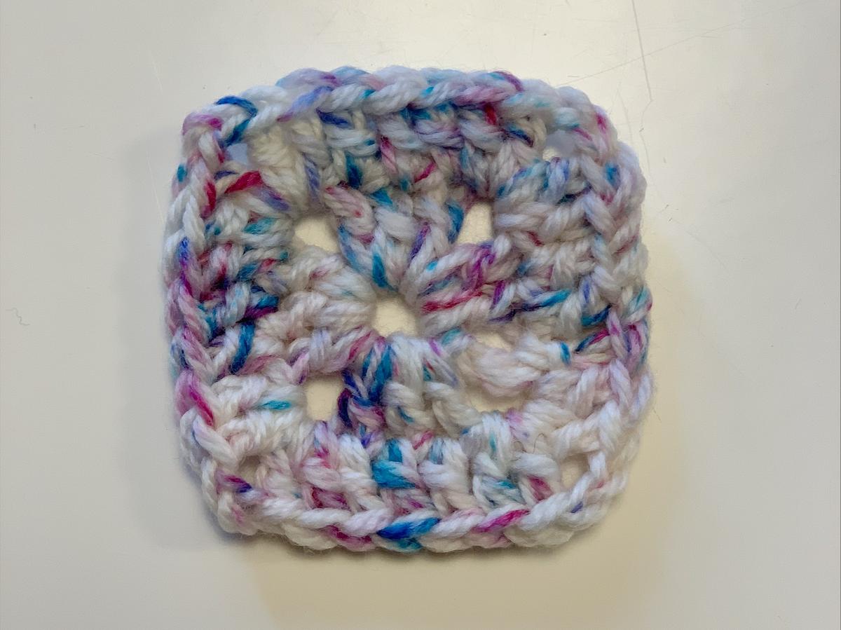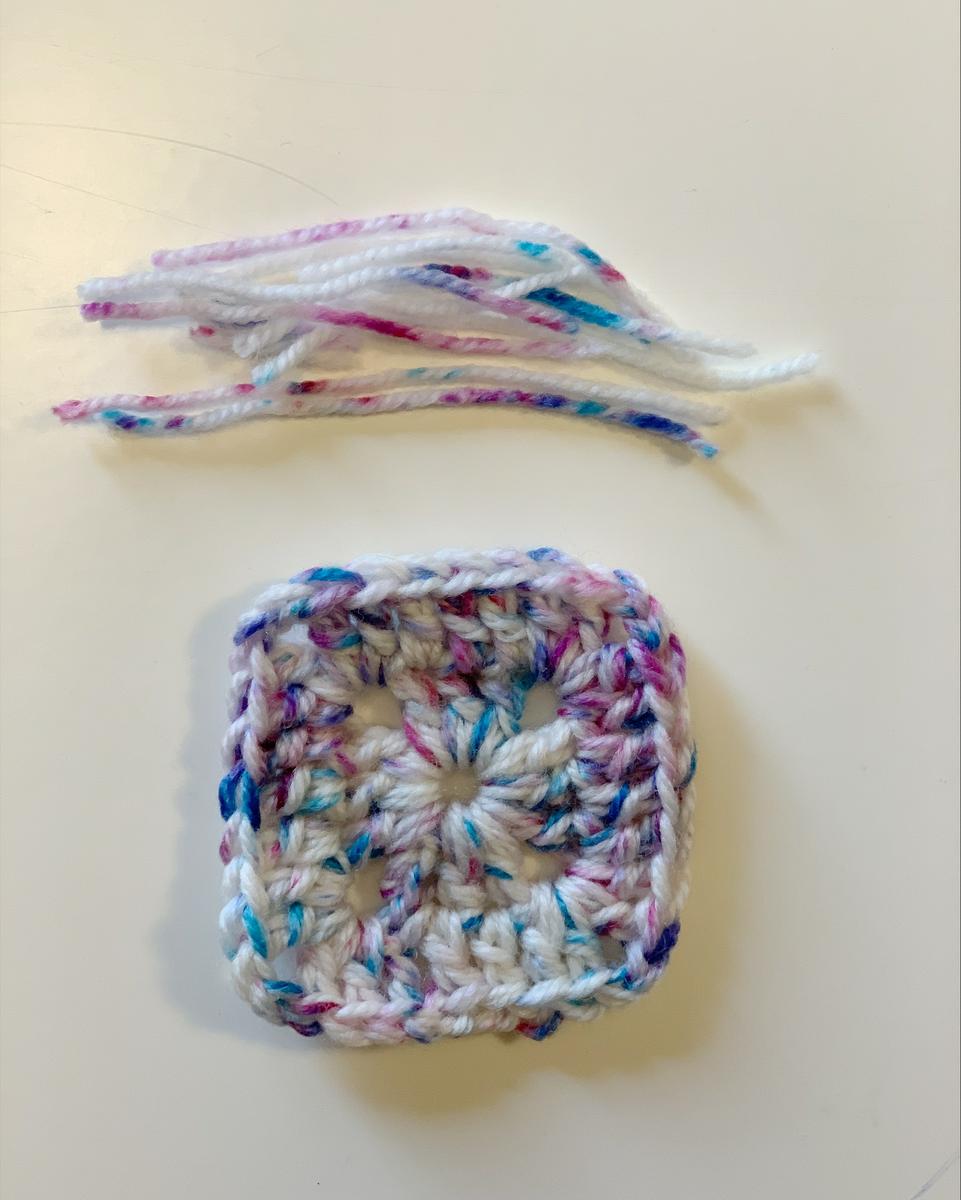 y opté por hacer el cuadrado abuelita relleno con el centro de un color, y luego dos vueltas de la lana matizada, pero no me convenció.