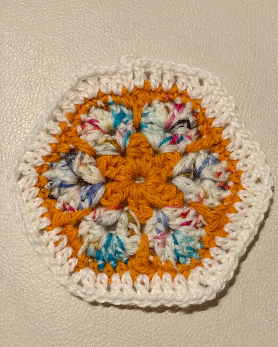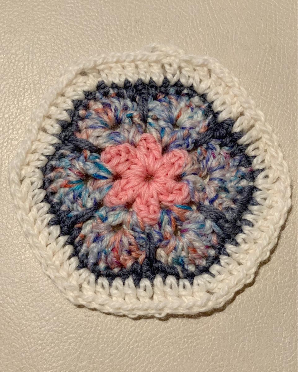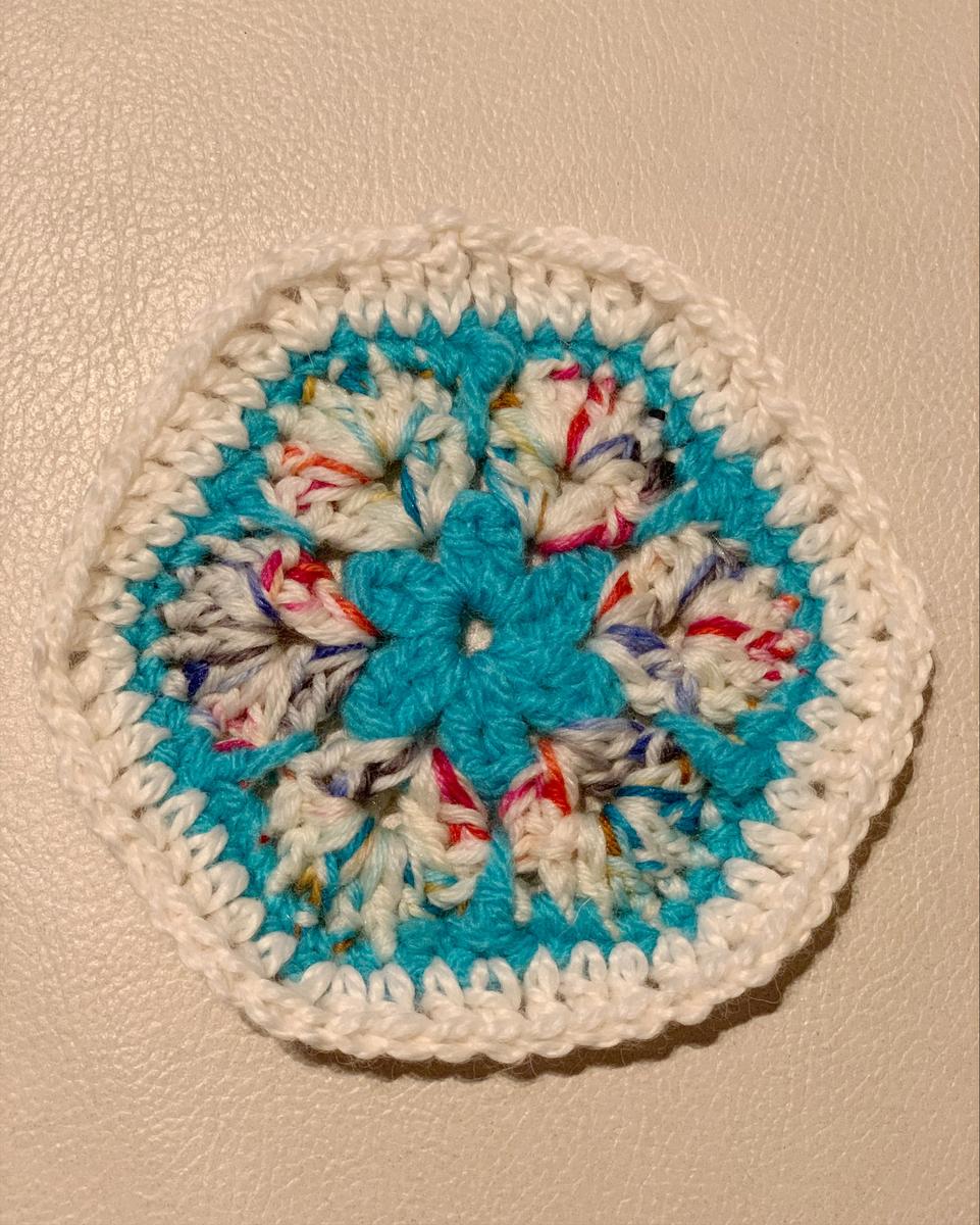 y opté por hacer el cuadrado abuelita relleno con el centro de un color, y luego dos vueltas de la lana matizada, pero no me convenció.