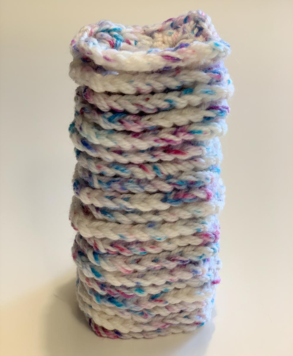 En un viaje por Uruguay, pasé por el local de Manos del Uruguay (acá las direcciones) y me compré varias madejas de lana blanca con manchas de colores. No todas tenían las mismas combinaciones de colores, predominaba el blanco y luego en un segundo plano el resto de los colores.